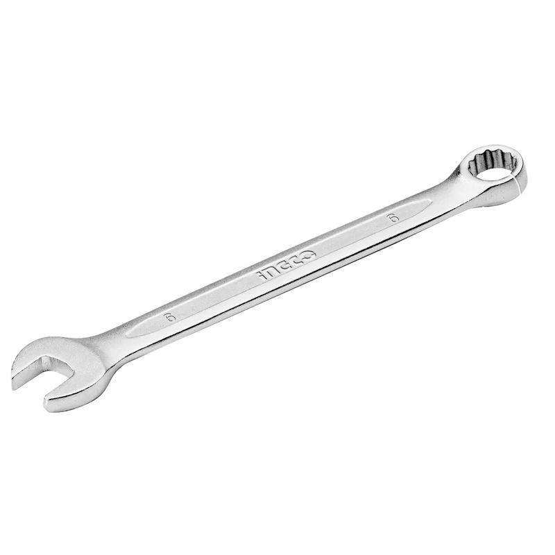 Chave combinada Ingco 06mm, fabricada em aço cromo-vanádio (Cr-V), material de alta resistência e durabilidade. Possui um lado fixo e outro estrela, permitindo versatilidade no aperto e desaperto de porcas e parafusos de 6mm. Indicada para uso mecânico, manutenção industrial e montagem de estruturas.