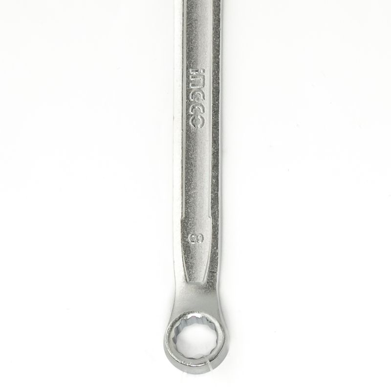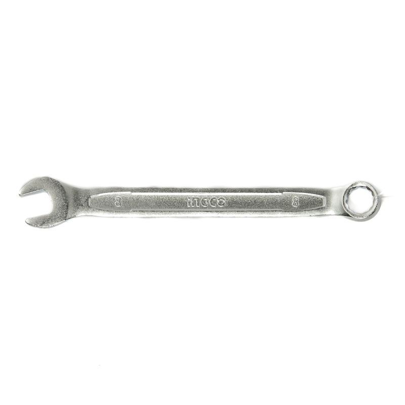 Chave combinada Ingco 08mm, ferramenta robusta feita em aço Cr-V, com extremidades fixas e estrela para melhor encaixe em porcas e parafusos de 8mm. Utilizada em reparos mecânicos, instalações elétricas e manutenção geral.