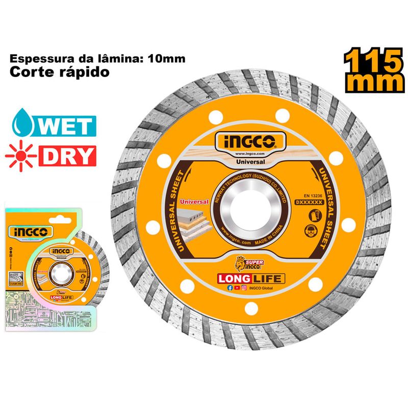 Cortes rápidos e precisos em revestimentos médios! O Disco Diamantado Turbo INGCO de 4.1/2” (115mm x 22.2mm) é a escolha ideal para quem busca eficiência e durabilidade. Projetado para cortes secos e molhados, proporciona acabamento limpo e preciso em materiais como granito, ardósia e mármore. Com largura de corte de 10mm, garante maior estabilidade e resistência, sendo indispensável para profissionais da construção e reformas. Qualidade INGCO para um desempenho superior!