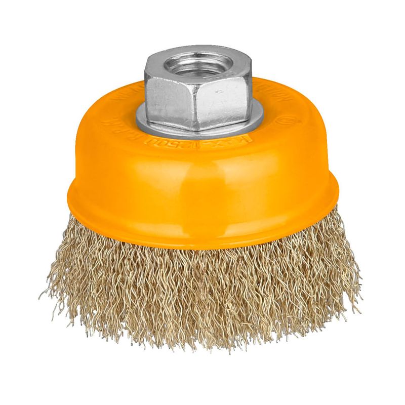 A Escova de Aço Tipo Copo INGCO com arame ondulado de 4” é ideal para limpezas intensas, remoção de ferrugem e acabamento de superfícies metálicas. Com rotação máxima de 8.500 rpm, oferece alta eficiência em aplicações pesadas. Seu filamento de 0,3 mm garante uma ação de limpeza precisa e eficaz, enquanto a rosca de encaixe M14 proporciona excelente compatibilidade e segurança em esmerilhadeiras e outras ferramentas elétricas.