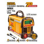 Seu sistema bivolt automático (110-120V / 220-240V) adapta-se facilmente à rede elétrica, garantindo uma corrente de saída de até 250A com ciclo de trabalho de 60%, ideal para uso intenso e prolongado. A tela LCD facilita o ajuste e o controle preciso da corrente.