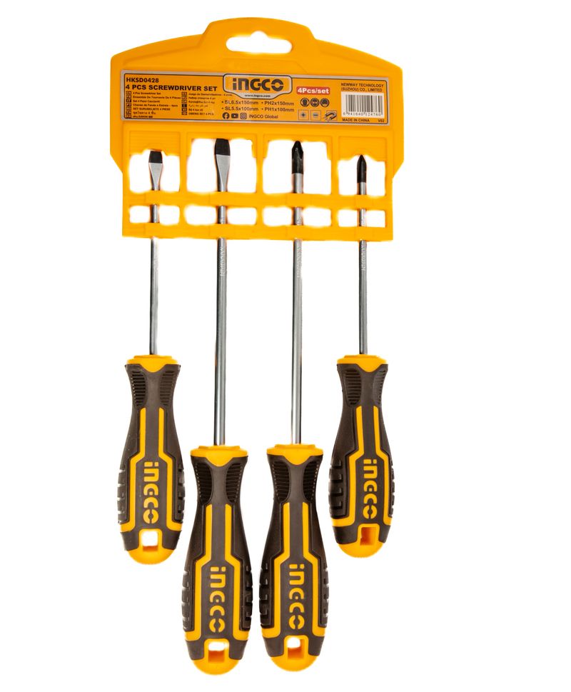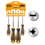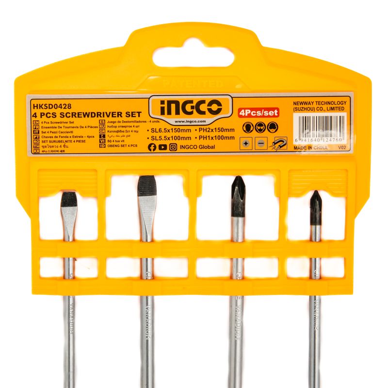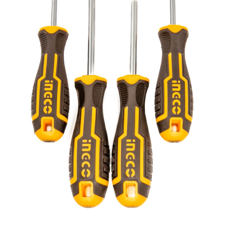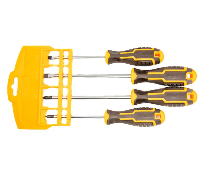 Conjunto de chaves de fenda e Phillips em aço cromo vanadium com acabamento cromado e pontas escurecidas. Cabos ergonômicos em fibra preto e amarelo, com alta resistência e conforto no manuseio. Ideal para diversos tipos de fixação e trabalhos de precisão, perfeito para quem busca qualidade e eficiência. Embalado em cartão expositor plástico.