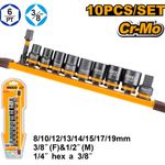 • 8 Soquetes de impacto 3/8”: 8, 10, 12, 13, 14, 15, 17 e 19mm